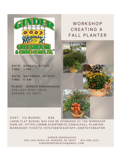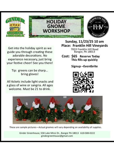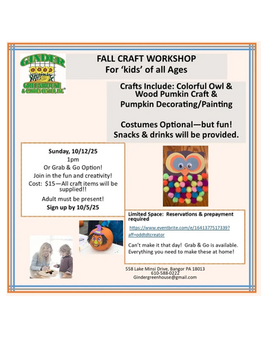 Have a question about our workshops? Would you like to host a private one for your friends, a special event? Contact us today and one of our team members will be happy to assist you. Call 610-588-0222 or email: gindergreenhouse@gmail.com